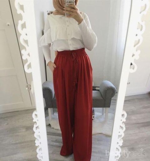 Untuk tampilan lebih feminin, kamu dapat juga memadukan celana palazzo kamu dengan atasan ruffle yang manis. Pilihlah ruffle blouse polos atau bermotif dengan tone warna lembut. Namun, tetap perhatikan atasan yang kamu gunakan jangan terlalu panjang, ya!