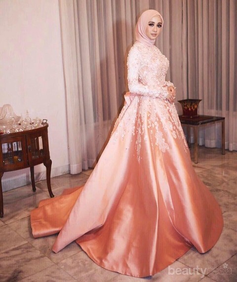 Dress dengan detail bordir mewah ala desainer ternama Ayu Dyah Andari. Pilihan warna baby pink dan nude sangat mewakilkan personality Bella yang manis dan lembut. Dress ini juga terlihat simpel dan menawan saat Bella padukan dengan hijab basic ala Bella.