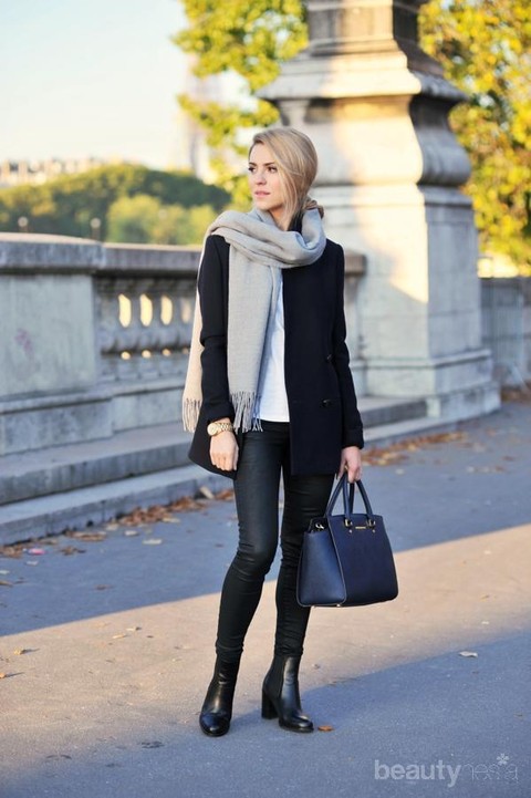 Menggunakan pakaian serba hitam memang tidak akan pernah membuat kamu ketinggalan jaman. Buat kamu yang menyukai gaya edgy, kamu bisa menggunakan long sleeves berwarna hitam, celana hitam, dan ankle boots. Untuk menyempurnakan penampilanmu, tentu saja jangan lupakan syal dengan warna abu-abu untuk memberikan penampilan yang semakin fashionable. Gaya seperti ini bakal cocok banget untuk kamu gunakan ketika pergi bareng teman-teman di akhir pekan.