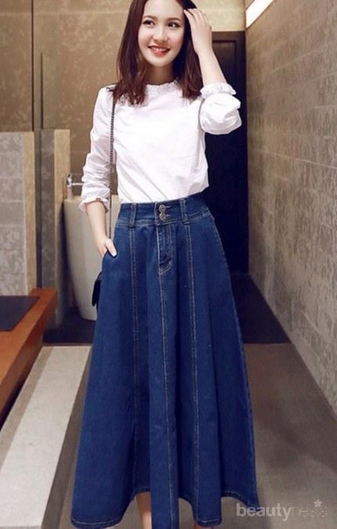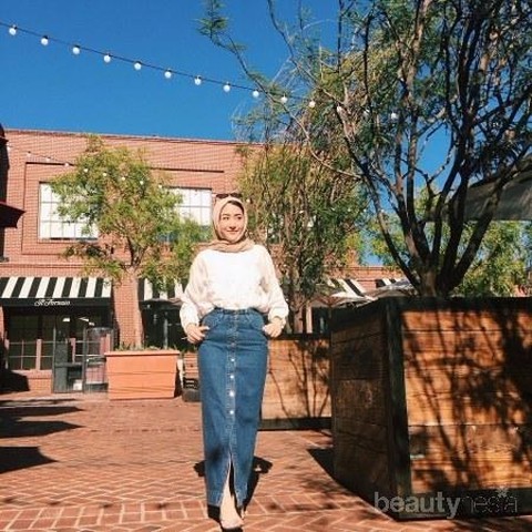Buat kamu yang berhijab, tentu kamu tetap bisa mengenakan mix and match rok denim ini. Tips pakaian satu ini tentunya  sangat cocok untuk tampilan casual saat kamu akan hangout ke mall pergi kuliah. Ya, mengkombinasikan rok denim panjang dengan atasan blouse tentu menjadi padu padan yang sangat menarik. Detail kancing depan pada rok denim membuat kamu terlihat ramping dengan sedikit belahan pada bagian bawah rok. Jangan lupa untuk memakai warna hijab pastel yang bisa bikin penampilan kamu tambah manis.