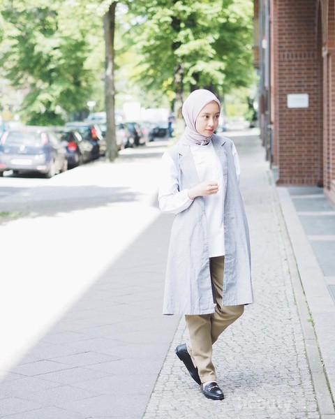 Biar tak terlihat terlalu monoton, tambahkan kemeja hijab putih kamu dengan luaran pemanis penampilan yang lagi hits banget ini. Untuk memberikan kesan kalem, pilih luaran tanktop yang berwarna coklat atau pastel. Hindari warna yang terlalu bright agar tak terkesan berlebihan dan tetap matching.