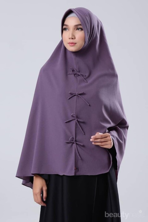 Khimar dengan detail pita-pita kecil dan tipis pada bagian depan ini cukup populer karena modelnya yang simpel dan manis. Kamu dapat menggunakan khimar model ini untuk pergi berjalan-jalan atau sekadar berkumpul bersama keluarga.