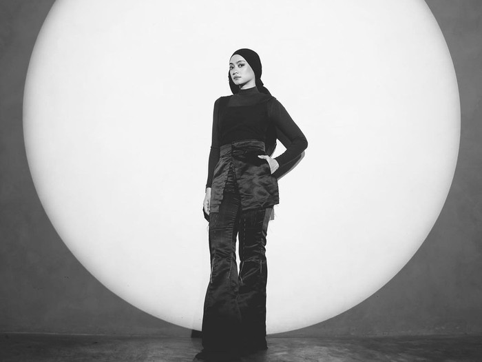 Ayudia juga mengenakan celana berwarna hitam dengan hijab warna senada. Kamu bisa lengkapi gaya ini dengan mengenakan sepatu heels warna pink dengan sling bag warna hitam untuk tampilan yang proper dan menawan.