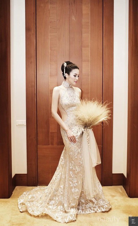 Gaun cantik ini bukan dikenakan saat resepsi, melainkan saat seremoni teh pada pernikahan Sandra Dewi. Gaun cheongsam (baju tradisional China) berwarna emas yang sangat cantik ini dirancang oleh desainer tanah air, Sebastian Sposa. Tidak seperti baju cheongsam pada umumnya, gaun ini memiliki bentuk siluet mermaid dengan bagian punggung terbuka. Cantik ya!