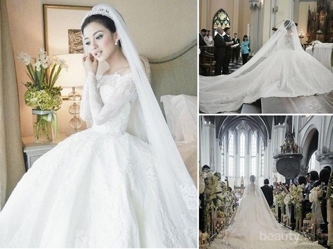 Ladies, masih ingat dengan pernikahan super mewah pasangan selebriti Chelsea Olivia dengan Glenn Alinskie? Pada pemberkatan pernikahan mereka tahun 2015 lalu yang dilaksanakan di Gereja Katedral Jakarta, Chelsea mengenakan baju pengantin model ball gown seberat 20 kilogram! Gaun rancangan desainer lokal Hian Tjen ini memiliki ekor memanjang yang terlihat sangat anggun dan megah. Tidak lupa, detil lacey serta model leher sabrina juga menjadikan gaun ini sangat ikonik!