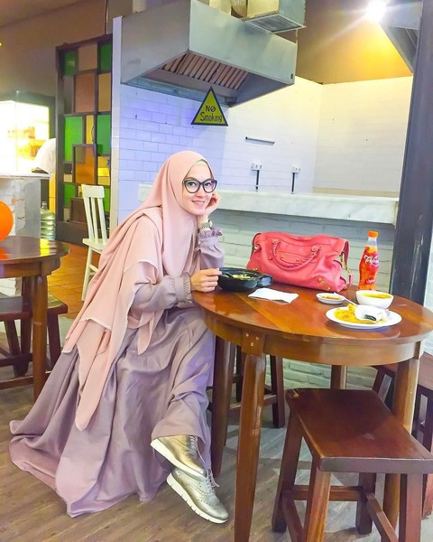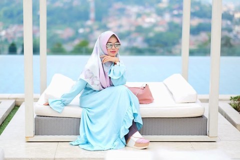 Desainer cantik yang populer dengan gaya hijab kekinian syar'i warna pastel ini selalu terlihat modis dengan padu padan outfit yang stylish from head to toe. Ghaida menggunakan wedges untuk perpaduan outfit long tunik ruffle yang simpel dan manis. Perpaduan ini dapat kamu gunakan saat berlibur atau hangout bersama keluarga di akhir pekan.