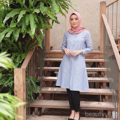 Atasan tunik ala Mega Iskanti juga dapat membuat tubuh tinggimu terlihat lebih ideal.