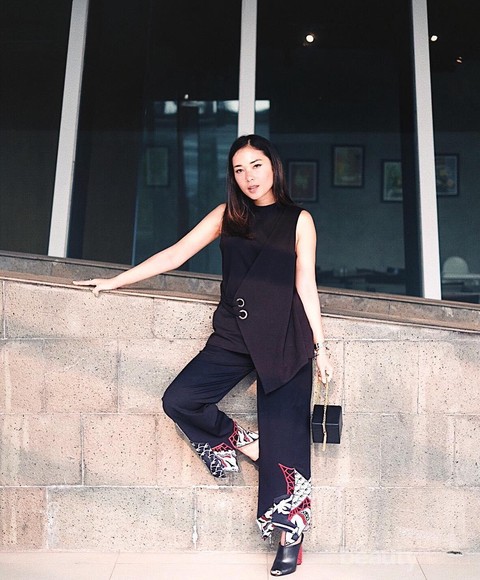 Nah, selanjutnya, kamu juga dapat mengikuti tren fashion dari Ayla Dimitri. Kali ini, Ayla menggunakan wide leg pants dengan detail motif pada bagian ujung kaki yang dipadukan dengan sleeveless top. Nuansa hitam membuat tampilannya terlihat bold, ditambah lagi dengan loafers hitam yang edgy menambah kesan modis pada stylenya.