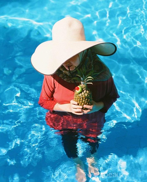 Jika kamu pergi ke pantai sekaligus untuk berenang, selain melengkapi penampilan dengan outer, kamu bisa memilih turban sebagai pengganti hijab. Turban merupakan penutup kepala yang mampu menghindarkan kamu dari kesan ribet berenang menggunakan hijab panjang.