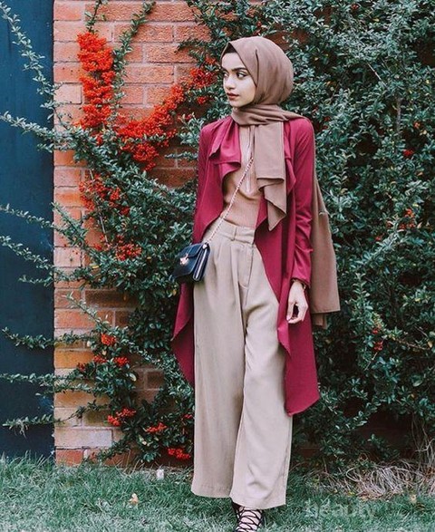 Kesan elegan pada gaya vintage-mu dapat diciptakan dengan memberi sentuhan warna maroon. Padukan hijab dan atasan warna coklat dengan outer atau long cardigan warna maroon. It's a perfect match!