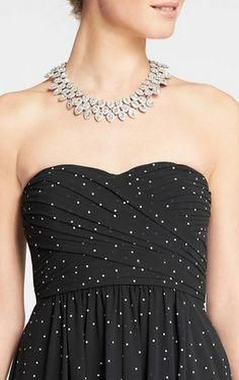 Outfit strapless justru memberi kesempatan lebih untuk membuat statement fashion dengan berbagai macam kalung. Nah, kamu bisa menggunakan choker atau kalung berliontin pendek. Bisa juga menggunakan kalung yang lebih besar dan kalung rancangan dengan dekorasi yang lebih rumit. Akan lebih baik jika posisi kalung satu inci diatas neckline baju.