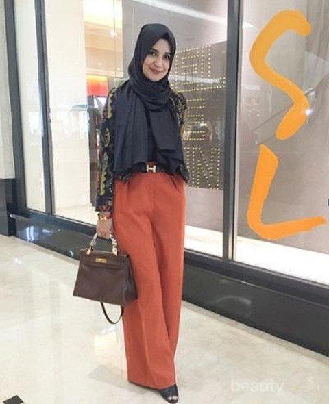 Untuk kamu yang ingin terlihat lebih dewasa dan sedikit formil, kamu bisa banget mencontek gaya Shireen Sungkar dalam memadu padankancelana palazzo berwarna orange polos dengan kemeja bermotif dan pilih hijab scraft agar penampilanmu semakin modis.