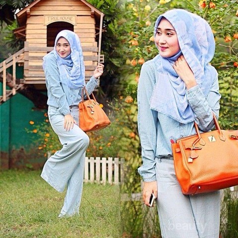 Gaya Dian Pelangi yang satu ini bisa banget lho kamu tiru ladies. Ia terlihat kece dengan padu padan celana hijab palazzo dan kemeja denim. Nah, biar kamu makin kece padankan dengan hijab pattern atau yang berwarna cerah.