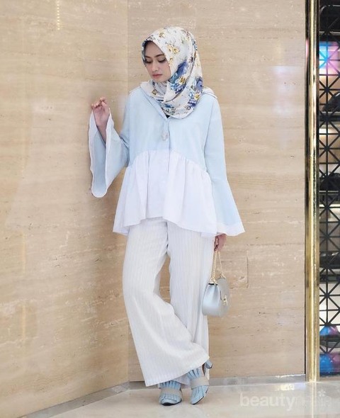 Gaya selebgram hijab yang satu ini bisa banget lho dicontek untuk kamu yang ingin tampil feminim dan tetap terlihat catchy. Ia sukses memadu padankan celana palazzo dengan flare blouse yang kekinian. Agar penampilanmu semakin keren, gunakan floral hijab dengan warna yang senada.