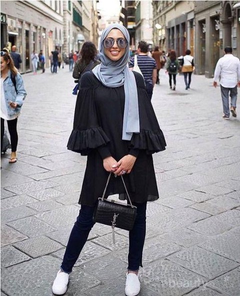 Flare blouse memang sedang jadi favorit hijabers Tanah Air maupun internasional. Tak heran jika semua toko belanja online maupun mall menjual blouse yang sedang kekinian ini lho ladies. Flare blouse dengan warna solid yang dipadankan dengan pashmina katun seperti gambar ini bisa jadi inspirasi style sehari-hari kamu lho.