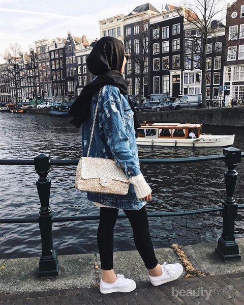 Untuk tampilan yang super fashionable, coba deh kamu kenakan ripped jacket jeans dalam tampilan kamu! Fashion item ini memang dapat membuat tampilan kamu keren banget tanpa perlu tambahan aksesoris lainnya. Tampilan baju muslim ini bisa kamu gunakan dengan memadukannya bersama jeans ataupun celana kulot.