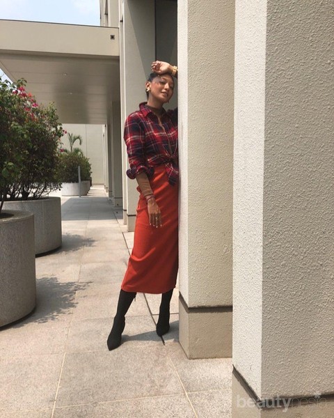 Foto: IstimewaDalam balutan kemeja flanel bernuansa warna merah dan hitam, Asmara Abigail sukses menampilkan konsep edgy. Ia memadukan kemeja flanel tersebut dengan rok pensil dengan gradasi tone yang senada. Tidak sampai mata kaki, melainkan rok yang dikenakan perempuan berusia 27 tahun itu 7/8. Penampilannya semakin sempurna dengan sentuhan akhir thigh-high boots sock hitam. Gaya edgy kemeja dan rok ala Asmara Abigail ini cocok ditiru untuk aktivitas semi-formal, seperti hangout atau meeting santai bersama rekan kerja.