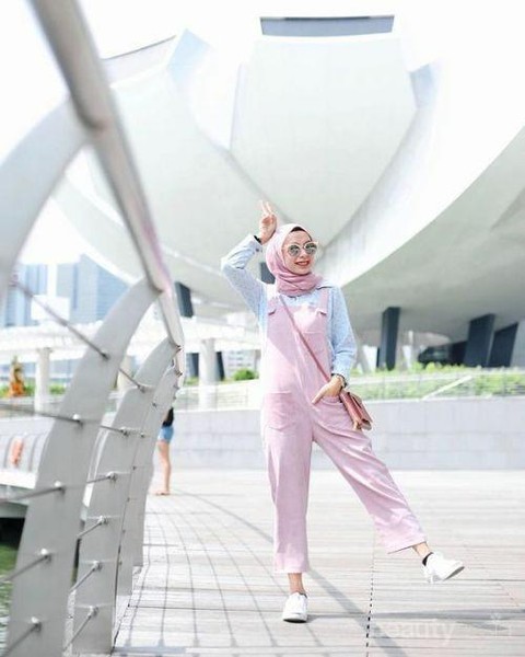Lagi nggak pengen tampil formal tapi tetap fashionable dengan pastel? Jumpsuit pastel adalah jawabannya. Kamu akan terlihat casual namun tetap anggun dengan jumpsuit pink pastel dan kemeja biru pastel bersamaan. Ditambah hijab pink dan sneaker putih akan membuat kamu tampak super-cool.