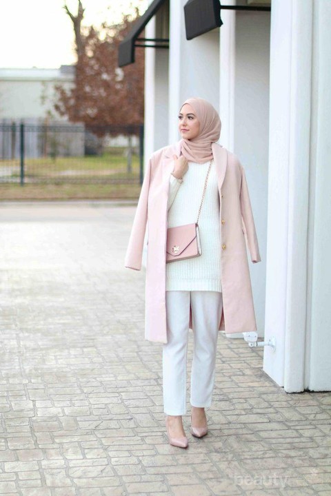 Putih, pink, dan brown... Why not? Kamu bisa pakai sweater berwarna broken white dipadukan celana putih, lalu padukan dengan coat pink pastel. Cute. Untuk hijab, kamu bisa gunakan warna soft bronze/brown untuk kesan lebih lembut dan cute. Jangan lupa tas dan sepatu pastel juga, Ladies.