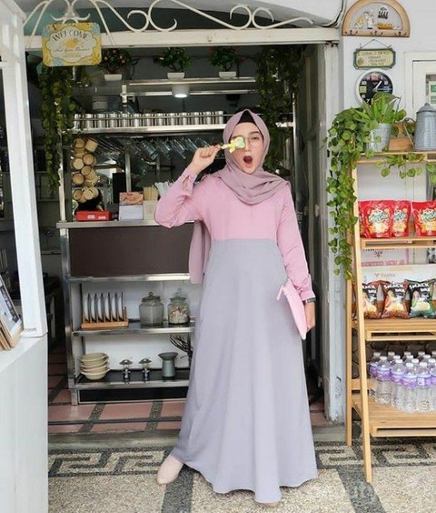 Hijab tentu identik dengan gamis. Bagi kamu yang mungkin bosan dengan gamis dengan hanya satu warna, perpaduan dua warna pastel dalam gamis bisa menjadi pilihan yang sangat tepat, lho. Kamu akan tampak girly dan fresh dengan warna pastel ini. Jangan lupa warna sepatu, hijab dan tas yang juga pastel ya, Ladies.