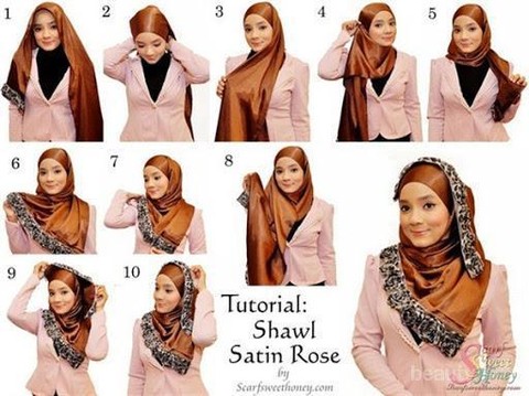 Pashmina dengan bahan satin biasanya lebih sulit dikreasikan karena teksturnya yang licin dan mengkilap. Akan tetapi model ini sebenarnya sangat cocok digunakan untuk menghadiri acara-acara formal karna menghadirkan kesan mewah dan elegan. Meski begitu, menggunakan pashmina satin tidak bisa kamu bentuk seenaknya. Karena efek glossy dan warnanya yang mencolok sudah cukup menarik perhatian. Model simple seperti tutorial hijab pashmina berikut ini bisa kamu coba ladies.