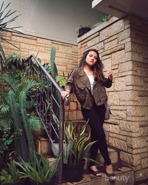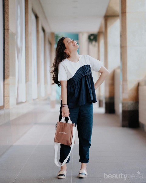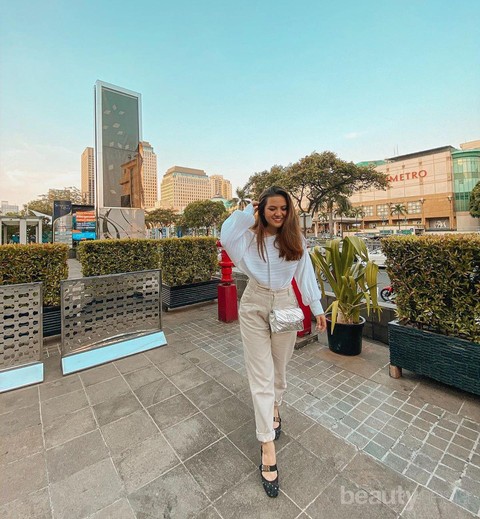Untuk kamu yang suka tampil girly, tips padu padan Marsha Aruan ini bisa banget buat ditiru. Kamu cukup memadukan oversized blouse putih dengan celana jeans berwarna krem. Buat mempermanis penampilan tambahkan flatshoes berwarna netral seperti hitam. Tampilan kamu bakal terlihat manis dan cantik dengan pilihan outfit yang satu ini.