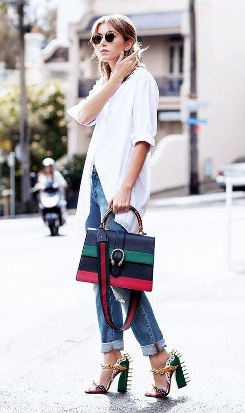 Gaya street style yang ini unik banget, ladies! Meski outfit yang dipilih sangat simple, yaitu long white basic shirt dan basic jeans, namun match antara sepatu dengan tas bikin kita nggak bosan menatap look yang satu ini. It's a Gucci bag, of course, serta block heels yang unik banget dengan aksen paku-paku pada bagian luar heels dan detail strap yang lucu. Warnanya pun matching dengan Gucci bag. It's definitely a classy fashionSuperb!