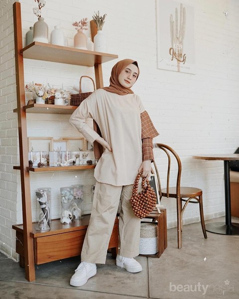cute banget ladies. Kamu bisa padu padankan kulot warna coklat susu dan atasan yang juga berwarna senada. Seperti yang dikenakan Helmi Nursifah di atas emang klop banget. Motif plaid di lengan kiri dibuat sama warnanya dengan hijab sehinga tampilannya