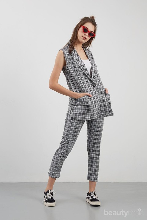 Tren setelan bukan cuma bisa kamu dapatkan dengan memadukan blazer saja, tetapi juga paduan vest dan celana dengan motif serupa! Seperti sleeveless long vest bermotif kotak ini misalnya. Selain lebih unik, gaya ini juga lebih kasual dan cocok untuk kamu yang malas memakai blazer untuk jalan-jalan. So stylish!