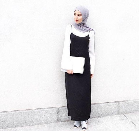 Atau kamu bisa memanfaatkan atasan berwarna putih polos sebagai pelengkap gaya overall hijab dress melalui monokrom statement. Nah, model kekinian dari blouse adalah aksen flare di ujung lengan. Dengan begini, kamu bisa terlihat fashionable juga tetap terlihat edgy dengan siluet warna hitam putih.