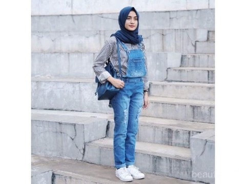 Selain itu, kamu juga harus memilih innerwear yang cocok untuk dipadankan bersama overall. Salah satu potongan baju yang cocok adalah baju belang-belang atau stripes top. Hampir seluruh overall cocok dikombinasi dengan baju ini. Caranya cukup mudah, kamu tinggal memilih hijab berwarna netral sebagai penetralisir warna dalam penampilan keseluruhanmu. Jangan lupa lengkapi penampilanmu dengan sneakers kece seperti sepatu putih ini!
