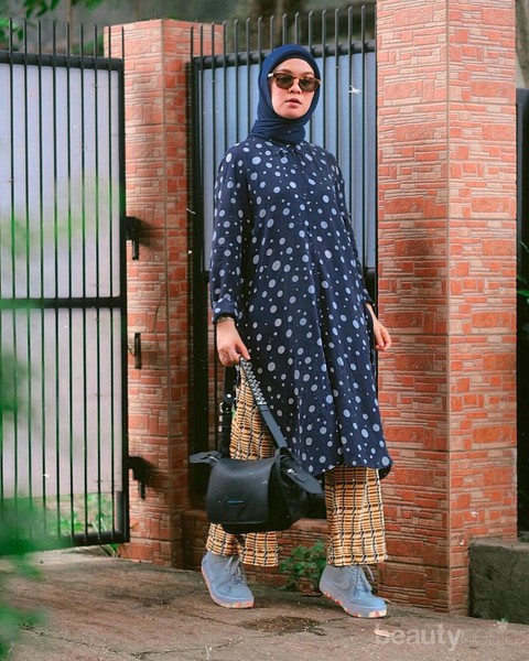 Sesekali kamu perlu berani dalam memadu padankan outfit keseharianmu. Seperti mix and match ala Tantri Namirah ini. Ia nampak berani memadukan tunik berwarna dasar navy bermotif polkadot dengan bawahan kulot longgar bernuansa warna jingga bermotif garis. Kamu yang berbada mungil bisa meniru gaya ini. Untuk pilihan jilbabnya kamu bisa memilih warna yang senada dengan tuniknya.