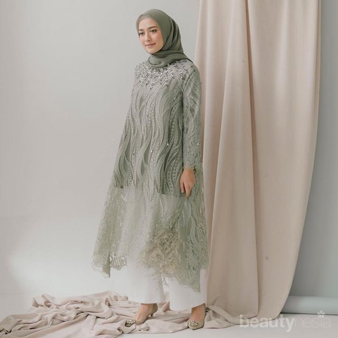 Memakai baju tunik terbaru 2019 hanya untuk acara santai? Enggak selalu lho, Ladies. Nyatanya tunik juga bisa dikenakan saat acara formal seperti pesta pernikahan. Perhatikan tunik warna hijau pastel yang dikenakan Aghnia Punjabi ini. Aksen batu mewah dan bahan brokatnya mampu menyulap tunik menjadi lebih mewah dan berkelas. Untuk bawahannya, cukup kenakan kulot putih. Lengkapi dengan jilbab simpel warna senada untuk kesempurnaan penampilanmu saat berpesta.