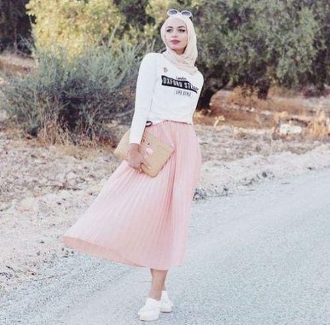 Cara mix 'n match rok hijab untuk tubuh kecil adalah dengan mengenakan rok yang panjangnya agak sedikit di atas mata kaki. Jadi, kamu jangan pilih rok yang tepat jatuh di mata kaki kamu, ya! Sebab hal ini akan mempertegas bentuk tubuhmu yang kecil. Kamu bisa juga memadukannya dengan sneakers yang memiliki sol agak tebal. Kedua fashion item ini merupakan perpaduan yang tepat untuk tampilan ke kampus. Bisa juga tampilan ini kamu gunakan untuk ke kantor, lho! Tinggal gunakan atasan kemeja, agar tampilan kamu terlihat lebih formal. Kamu juga bisa tambahkan beberapa aksesoris dengan ukuran small to medium, seperti anting maupun kalung.