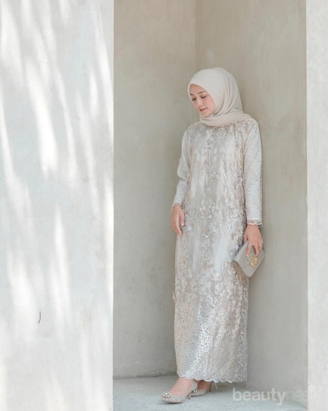 Bagi kamu yang ingin tampilan kamu terlihat manis saat menghadiri kondangan bisa banget contek gaya yang satu ini. Memadukan tunik brokat berwarna nude dengan rok ikan duyung berwarna senada sehingga akan membuat tampilan kamu simple namun tetap mewah untuk kondangan. Kenakan hijab pashmina yang diikat ke belakang dijamin penampilan kamu terlihat sangat manis sekali.