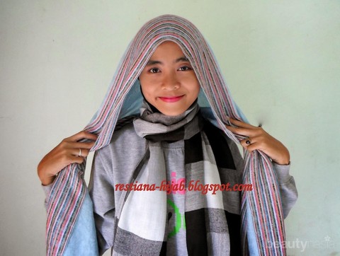 Foto: https://www.restianahijab.com/Pertama, gunakan hijab segi empat seperti biasa dengan direkatkan menggunakan jarum pentul. Tarik kedua sisi berseberangan dan ikat di belakang leher. Ambil scarf warna senada atau warna lain yang nampak cocok. Lipat scarf menjadi segi tiga dan gunakan di depan dada lalu ikatkan kedua sisinya di belakang leher.