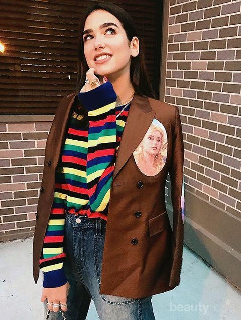 Tampil dengan gaya kasual yang berwarna ala Dua Lipa untuk mengisi waktu-waktu santaimu. Inspirasi fashion yang satu ini juga gak kalah unik. Dua Lipa mengenakan sebuah rainbow sweater yang ujunngnya dimasukkan ke dalam celana jeans high-waist. Salah satu item fashion yang membuatnya makin unik adalah boyfriend blazer warna cokelat ini. Aksen buttoned pada bagian bawah, serta sebuah patch dengan foto Marilyn Monroe pada bagian dada membuatnya tampilannya gak biasa!