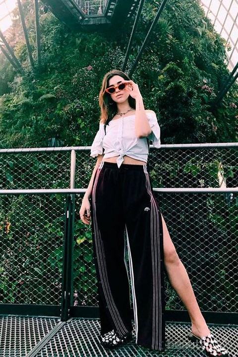 Gaya sporty ala Dua Lipa ini membuatnya terkesan lebih feminin. Penyanyi asal Inggris ini memadukan sebuah training pants dengan detail split pada bagian pinggirnya. Membuatnya nggak terkesan kaku. Off-shoulder top, dengan detail kancing pada bagian tengah dan berdesain crop pada bagian bawah, sebagai atasan dipilihnya untuk kesan lebih feminin. Bukan sneakers sebagai alas kaki, penyanyi cantik ini memilih sebuah pattern sandals. Statement necklace dan half glasses gak ketinggalan untuk menyempurnakan penampilan.