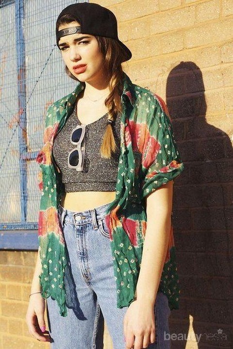Gaya kasual yang satu ini lebih mirip dengan skater style yang dipakai oleh para pemain skateboard. Sebuah crop top dikenakan bersama high-waist jeans. Printed shirt dikenakan sebagai outer yang membuat gayanya makin santai dan keren. Sebagai tambahan aksesoris, Dua Lipa mengenakan sebuah snapback dengan posisi terbalik serta sebuah kacamata yang diselipkan di bagian atas crop top-nya.