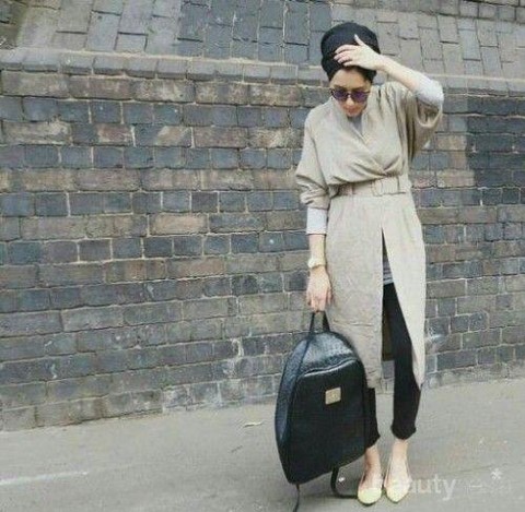 Tampilan casual elegan untuk style hijab turban pertama yang bisa kamu contek adalah padu padan dengan coat. Outer yang simpel dan elegan ini memang sangat bisa diandalkan untuk gaya fashion hijab pada tampilan traveling yang ringkas, nyaman, tapi tetap fashionable. Kamu bisa memadukannya dengan basic pants dan inner top.