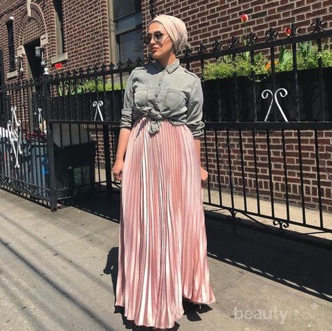 Selanjutnya, kamu juga bisa mencoba tampilan hijab casual dengan menggunakan padu padan rok plisket dan kemeja denim seperti ini. Tampilan hijab ini sangat bisa untuk kamu gunakan pada tampilan saat hangout dengan teman-teman. Dijamin kamu akan terlihat stunning dan beda, khususnya untuk gaya foto OOTD hijab harian kamu.