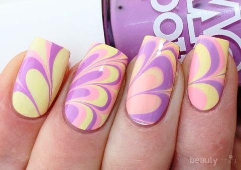 Lagi-lagi corak bunga tak pernah lepas dari modifikasi desain nail art. Kelopan bunga yang besar diaplikasi dengan teknik water-marbles sehingga nampak flawless. Kecantikan warna-warna feminin, seperti pink, ungu serta kuning mampu mengharmonisasi gaya abstak yang lembut.