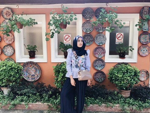 Gaya sederhana Vebby telrihat pada tampilan berikutnya. Ia memadukan floral tops, atasan seperti bordir, dengan wide leg pants. Tampilan ini sangat sederhana dan cocok kamu gunakan untuk tampilan sehari-hari. Perpaduan ini sangat nyaman dan sederhana sehingga kamu bisa beraktivitas sesuai dengan kebutuhan kamu tanpa repot memperhatikan tampilan kamu setiap saat. Hijab fashion dari Vebby ini bisa banget kamu tiru, lho, beautynesian! Untuk mempertahankan tampilan yang sederhana, kamu bsia mengenaka hijab style yang sederhana dan basic, ya.