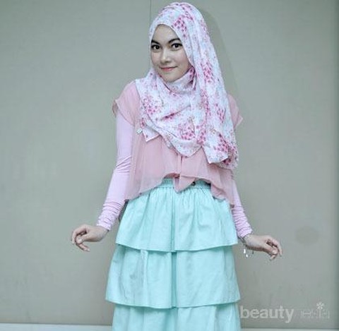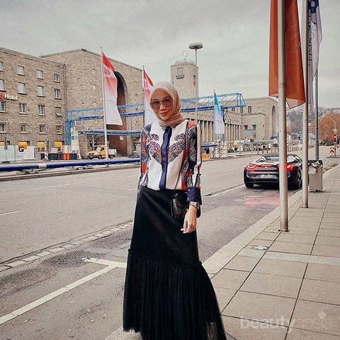 Dia memakai setelan blouse atau kemeja panjang dengan perpaduan warna yang menarik, rok panjang berwarna hitam, hijab berwarna nude, high heel berwarna putih, dan kacamata hitam bertengger di wajahnya membuat penampilannya begitu menarik dan stylish.