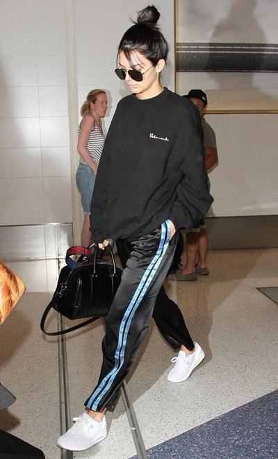 Sweater bisa juga menjadi pasangan track pants. Jangan takut terlihat fail, contek gaya Kendall Jenner yang satu ini. Sweater hitamnya dipadu track pants berwarna biru dan sepatu olahraga putih. Jangan lupa ikat rambutmu untuk mempertegas kesan athleisure dalam look kamu.