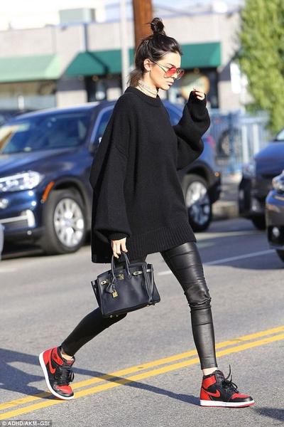 Pada suatu siang, Kendall Jenner memilih outfit yang pas dengan oversized sweater warna hitam yang menutupi tubuh rampingnya hingga ke bokong. Sedangkan kakinya dibalut leather legging yang terlihat nyaman serta wedge-sneaker dari Nike. Tak lupa sunglasses agar mata terlindung dari sinar matahari dan handbag lucu untuk melengkapi outfit.