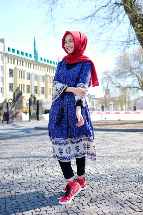 Fashion hijaber Indonesia, Indah Nada Puspita atau yang biasa dipanggil Nada memang terkenal dengan pemilihan padu-padan yang khas. Nada pada tampilan ini terlihat memadukan warna berani, warna merah dengan tunik berwarna biru. Selain itu, ia juga mengenakan sneakers warna merah yang senada dengan hijab yang ia kenakan. Nada terlihat mengenakan model hijab yang sederhana sama seperti saat mengenakan kerudung. Tunik yang ia kenakan pun memiliki detail motif seperti tribal di bagian lengannya dan bagian bawahnya.