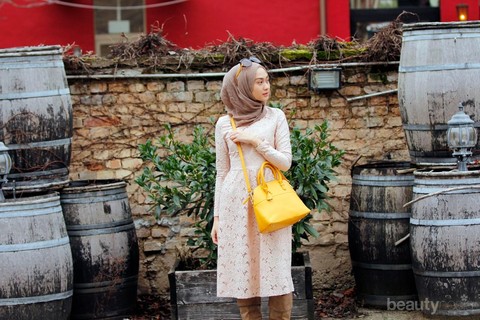 Memang Nada senang memadukan warna-warna yang vibrant pada satu look. Pada tampilan ini, Nada mengenakan monochrome outfit yang berwarna sekitar peach. Hijab Nada berwarna cokelat yang dipasangkan dengan tunik panjang berwarna peach pastel. Kemudian, ia juga mengenakan celana berwarna cokelat tua yang masih senada dengan warna peach. Dan, ini dia kejutannya, Nada mengenakan tas berwarna kuning. Warna yang cukup mencolok di antara warna-warna lainnya ini membuat tampilan Nada memiliki aksen yang berbeda. Selain itu, hal ini juga membuat tampilan Nada segar dan lebih cerah. Tampilan ini bisa banget kamu jadikan inspirasi untuk tampilan sehari-hari kamu, lho, beautynesian!