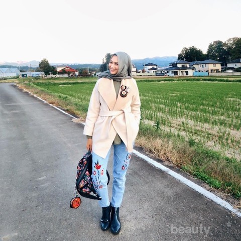 Nah, tampilan Nada yang ini diambil dari posting Instagram Nada pada bulan November ini. Ia memadukan celana jeans dengan aksen bordir bunga di bagian paha hingga lututnya. Aksen ini membuat tampilan Nada sangat edgy and sweet. selain itu, ia juga memadukan mantel berwarna pink pastel yang juga memiliki aksen di bagian dada. Oh, jangan luput dengan tas yang digunakan Nada, beautynesian! Ia mengenakan ransel dengan warna hitam yang juga memiliki motif bunga-bunga. Model hijab yang digunakan Nada kali ini sangat sederhana dengan hanya mengenakannya seperti mengenakan kerudung.