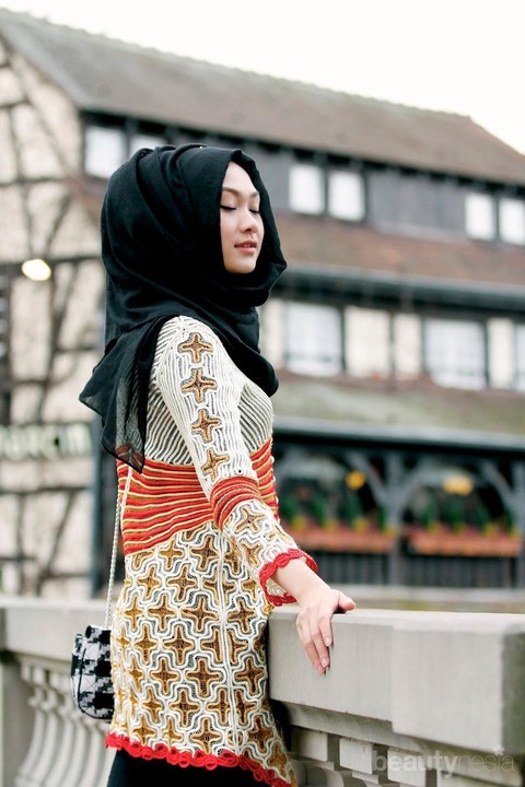 Nampaknya, Indah Nada Puspita senang mengenakan outfit yang bermotif baik pada atasannya, hijabnya, maupun bawahannya. Kali ini Nada terlihat mengenakan model hijab yang agak berbeda, yaitu dengan model tumpuk sehingga menampilkan aksen pada keseluruhan tampilan Nada. Kali ini ia memilih hijab warna hitam untuk menemani atasan yang bermotif batik. Tidak hanya Nada senang mengenakan berbagai motif pada fashion item-nya, ia juga senang dengan tas yang bermotif pula! Pada tampilan ini, Nada mengenakan sling bag yang bermotif dengan warna hitam-putih. Jika disandingkan, kedua motif ini tidak memiliki hal yang senada, namun Nada mampu membuatnya terlihat kece saat digunakan. Oiya, ini gaya Nada saat Januari tahun 2016.